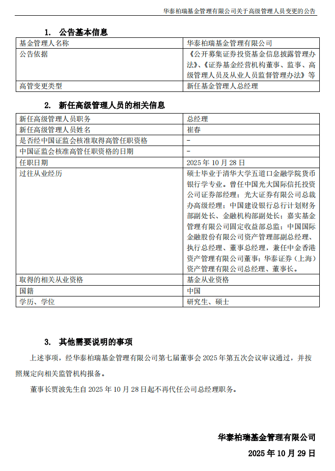 2025-10-31凤凰体育,凤凰体育直播,凤凰体育APP10月28日,华泰柏瑞基金公告称,前华泰证券(上海)资产管理有限公司(下称“华泰证券资管”)董事长崔春新任公司总经理,董事长贾波不再代行总经理职责。